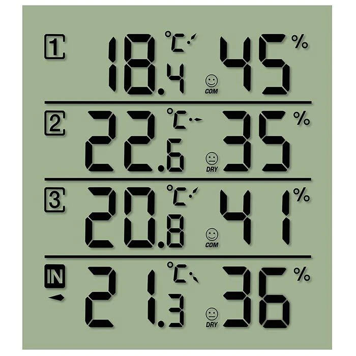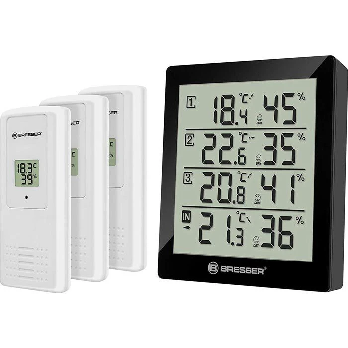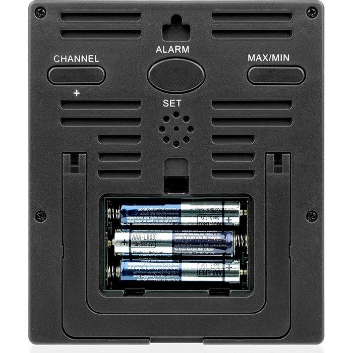 sonstiges: einstellbarer Alarm für Temperatur und Luftfeuchtigkeit, MIN.-/ MAX.-Funktion, Darstellung in °C oder °F, Außensensoren spritzwassergeschützt, großes übersichtliches Display, zum Hängen oder Stellen, schwarze Basisstation