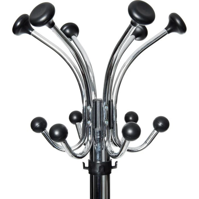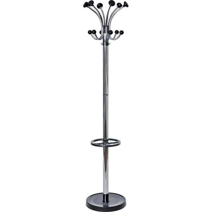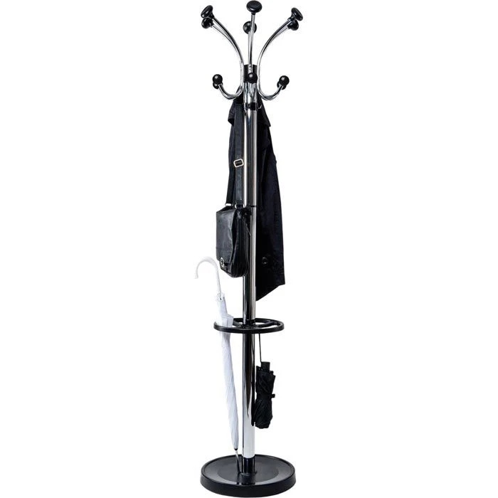 sonstiges: drehbare Hakenkrone mit 12 Hut- und Mantelhaken mit abgerundeten Kunststoff-Endstücken, je 4 zusätzliche Haken aus Kunststoff an der Säule und am Schirmständer, Schirmständer mit kratzhemmender, matt erodierter Fläche am Fuß, standsicher und stabil, schwerer Standfuß mit Betonfüllung und Kunststoff-Abdeckung, Fuß mit bodenschonenden Filzgleitern